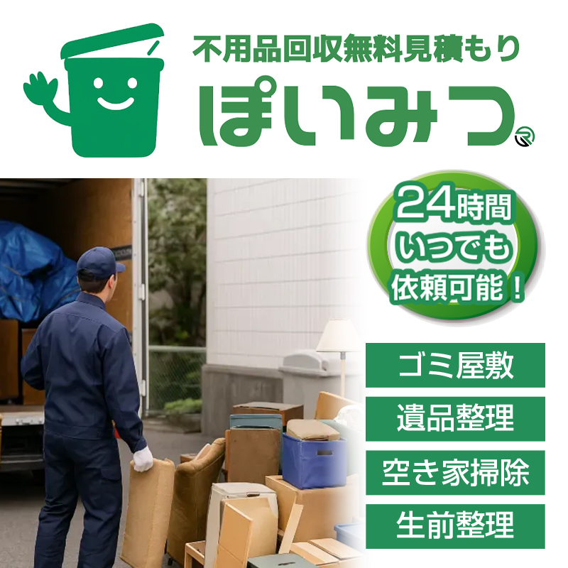 不用品回収無料一括見積もりサービス「ぽいみつ」は、不用品回収はもちろん、遺品整理、ゴミ屋敷清掃、空き家片付けなどの見積もりが可能です。
