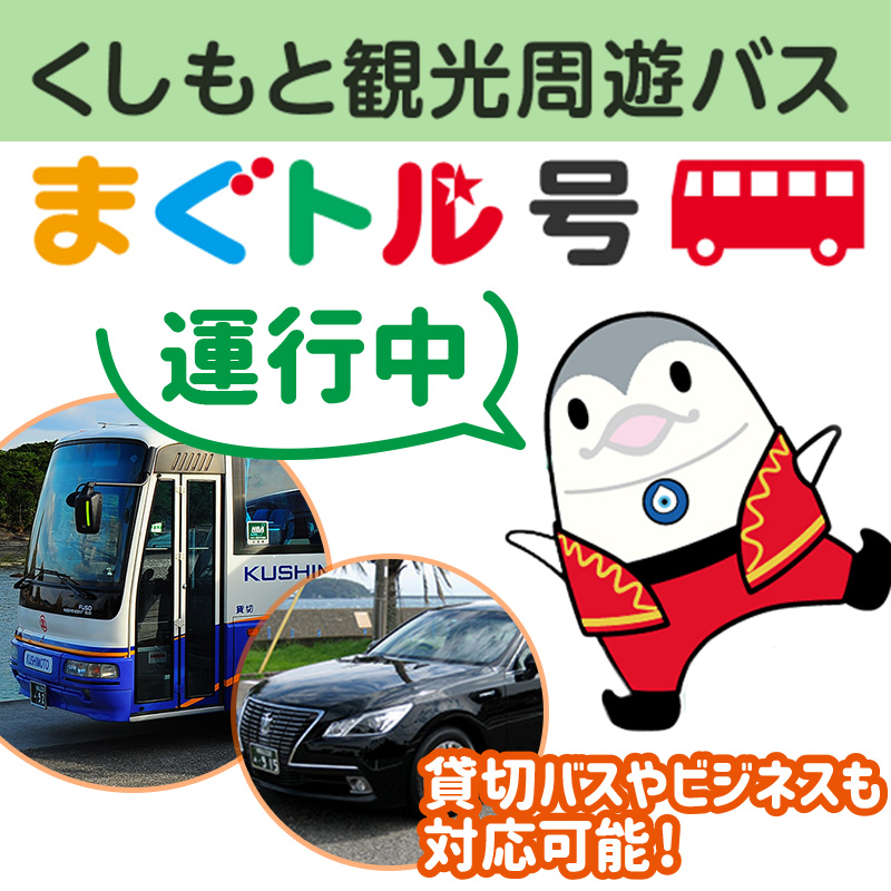 【和歌山県】串本、白浜、那智勝浦、熊野の観光・ビジネスならお任せください。介護タクシーや貸し切りマイクロバスもございます。串本町内の観光名所を巡る、くしもと観光周遊バス「まぐトル号」が運行。