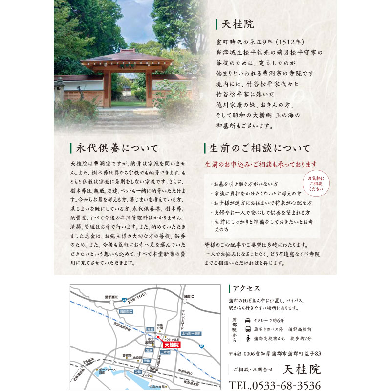 当院の境内には、竹谷松平家代々と竹谷松平家に嫁いだ徳川家康の妹、おきんの方、そして昭和の大横綱、玉の海の御墓所もございます。