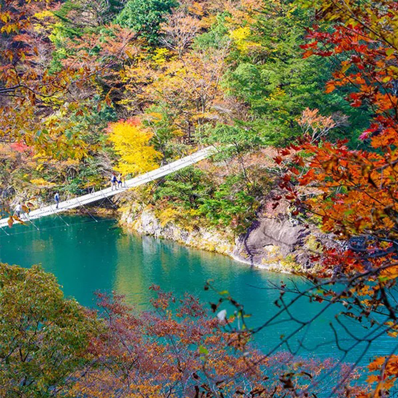 寸又峡といえば紅葉!といわれるほど見事な紅葉がみられます。特に『夢のつり橋』下のエメラルドグリーンの湖面と紅葉のコントラストは、是非一度見ていただきたい景色です。 ※16時までに渡り、お帰りください。