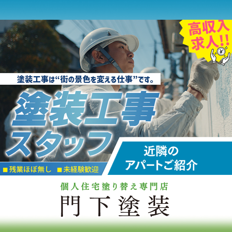 塗装工事スタッフ〈高収入求人〉 〜塗装工事は「街の景色を変える仕事」です〜 ・経験に関係なく、最初からしっかり稼げる環境! ・残業ほぼ無し ・近隣のアパートご紹介