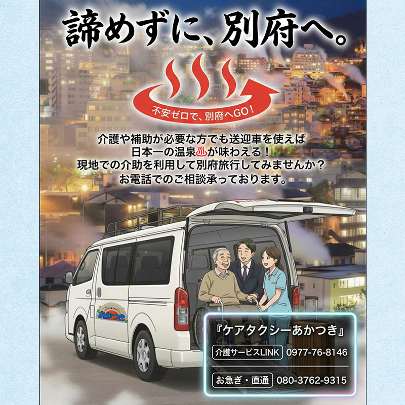 介護や補助が必要な方でも送迎車を使えば 日本一の温泉♨︎が味わえる! 現地での介助を利用して別府旅行してみませんか? お電話でのご相談承っております。 『ケアタクシーあかつき』 【介護サービスLINK】0977-76-8146 【お急ぎ・直通】080-3762-9315