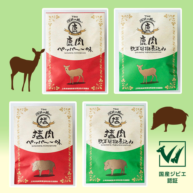 自然がもたらす 山のめぐみ。 国産ジビエ認証取得済み。常備食や備蓄用に。 お酒のお供にも最適です。 -------------------- ・鹿肉ペッパー味煮 ・鹿肉ゆず胡椒煮込み ・猪肉ペッパー味煮 ・猪肉ゆず胡椒煮込み 各90g ▼お求めはこちら https://nishimera-gibier.com/category/item/