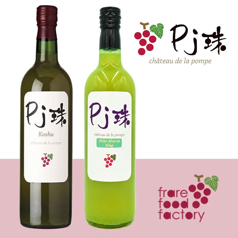 24銘柄にも及ぶワイン用のブドウの風味を絞り分けてこだわりの製法でお届けします。 【100%無添加】 《100%ピュアジュース〈Pj珠〉》 ◆甲州 720ml 3,024円 酸味をマイルドに整えた優れもの。 https://frarefood.shop/?pid=162703080 ◆シャインマスカットキング 720ml 10,800円 色出しと果肉加工が特徴で、世界でPj珠が唯一商品化。緑色が最大の特徴。