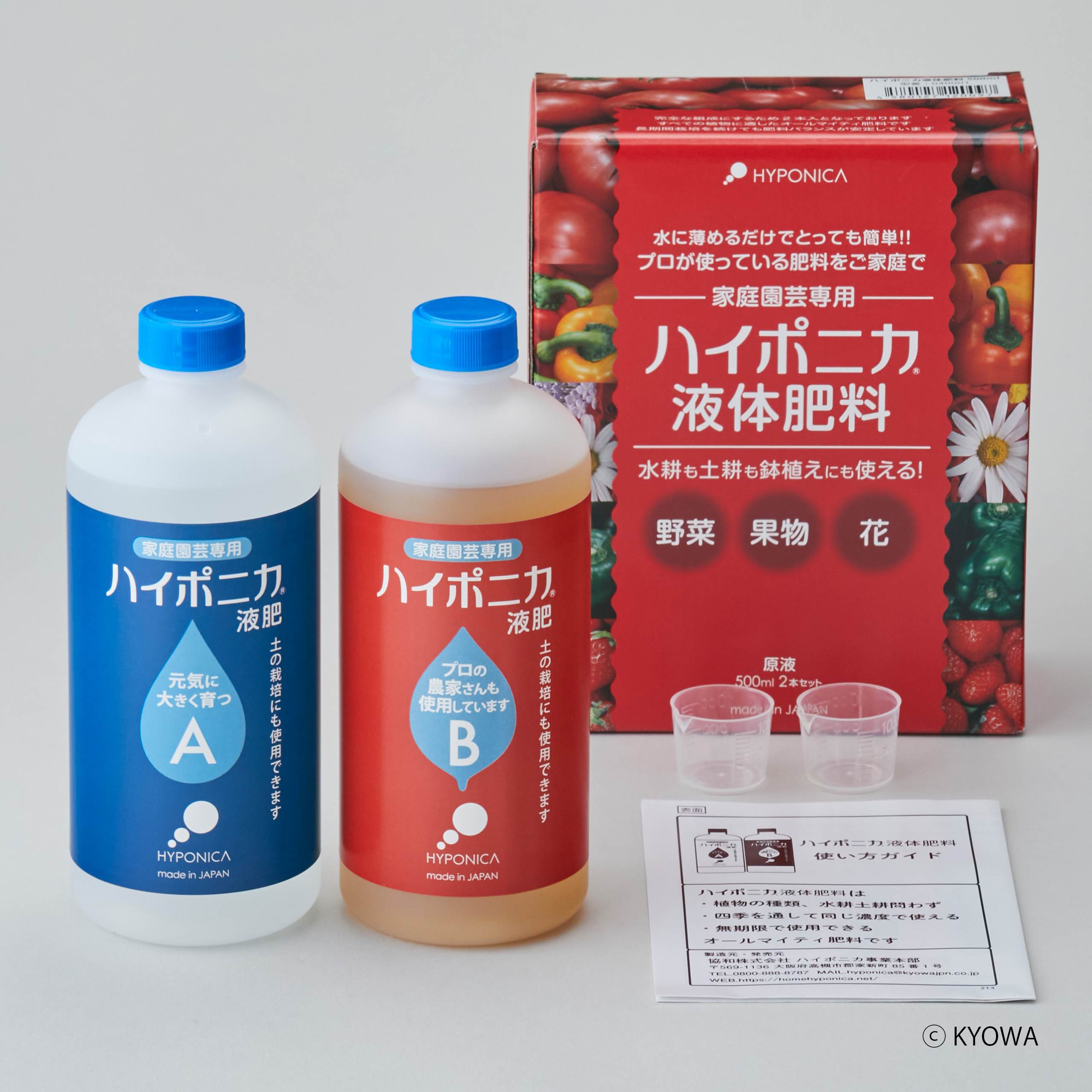 水耕栽培でご使用の場合、ハイポニカ液体肥料を500倍に薄めて使用します。