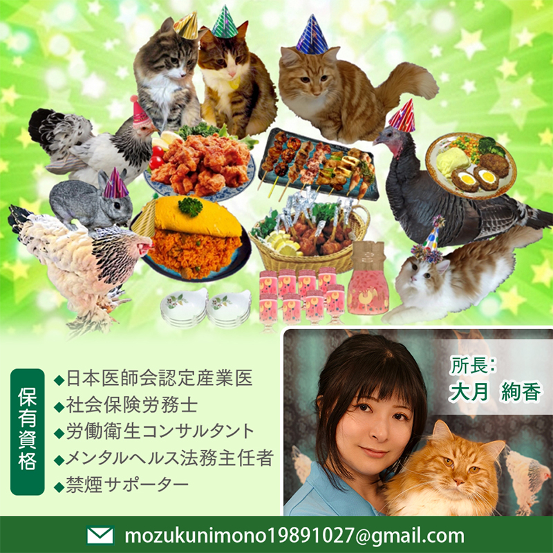 会社の健康経営の為に、ぜひ産業医を活用してみませんか?山陰地方で唯一、社会保険労務士と労働衛生コンサルタント登録を行っている産業医が開設。可愛い動物アシスタントが多く在籍する全国的にも珍しい事務所。社員さんの健康相談やストレスチェック&メンタルヘルス対応、女性特有のお悩みなど一人ひとりに向き合い「医学と法的」な視点からアドバイスを行い、誰もが健康で安全に働くことが出来る会社作りをお手伝いします。