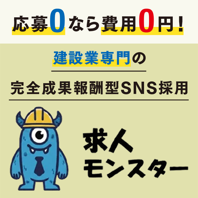バズり待ちの「運ゲー」はもう終わり。 求人モンスターは、広告を使って「欲しい人材」を狙い撃ちします! 【応募が来た分だけの成果報酬。ムダもリスクもゼロ!】 【建設業の応募が増える「動画の型」を熟知!】 【動画制作〜広告運用まで丸投げOK。広告費は当社負担!】