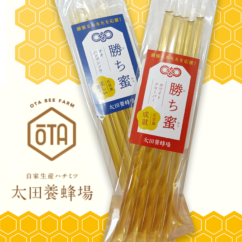 勝利を応援!勝ち蜜 当場オリジナルの『勝ち蜜』は、花言葉 「正しい選択・正義」のオオハンゴンソウと、 「成就・幸福」のホワイトクローバーの蜂蜜です。 スティックタイプで手も汚れません。 5袋(合計25本) 2,700円(送料込) 受験やスポーツの応援のプレゼントに、 商談前のゲン担ぎに、頑張る自分に。 頑張るあなたを応援します!