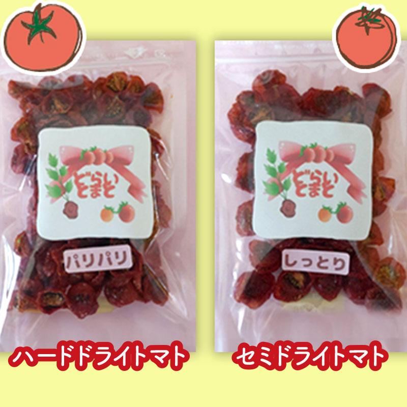 こだわりの製法で育てた甘く実ったミニトマトをハードタイプとセミドライタイプでご用意しました。 勿論そのまま食べてもトマトの味わいが口に広がって美味しいけど、オイル漬けにしたり、サラダやスープに加えたり、ピザのトッピングに使うと風味豊かな一品に。 アレンジを加え、美容や健康に役立ててネ! 50g×2袋 ¥1,300(送料込)